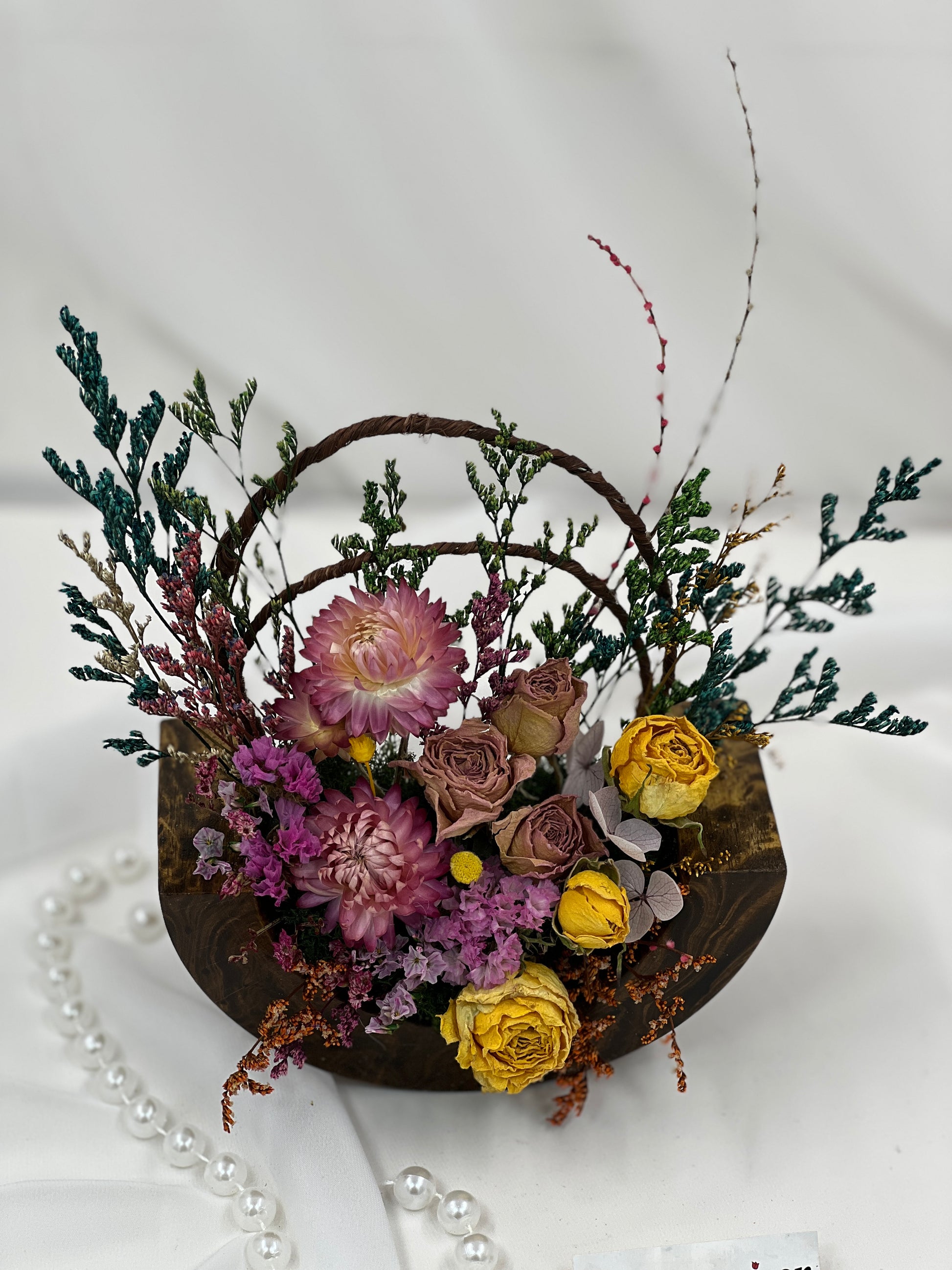 Habilement confectionnée avec des fleurs séchées et arrangée dans un support en forme de U unique, la Composition Éternelle Élégance dégage une beauté intemporelle qui durera des années. Chaque pièce est réalisée avec soin, garantissant un design unique qui ajoutera une touche d'élégance à n'importe quel espace.