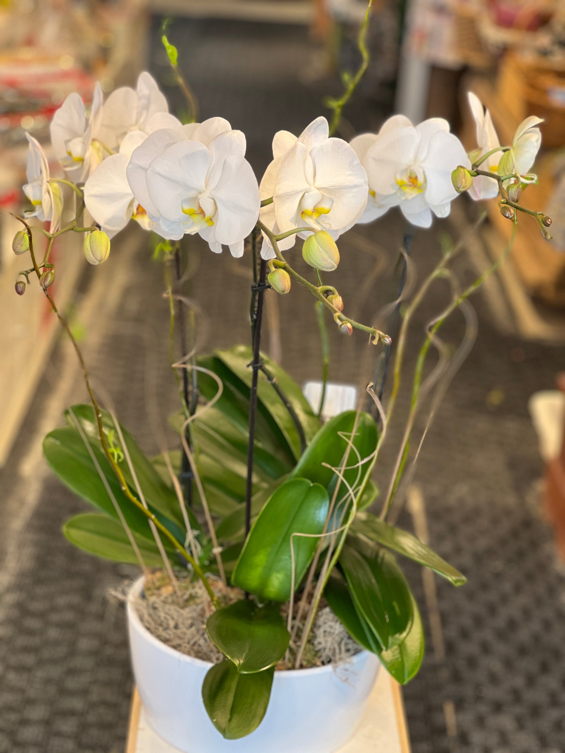 Une élégante composition d’orchidées phalaenopsis blanches présentée dans un pot en céramique minimaliste. Réputées pour leur beauté raffinée et leur floraison durable, ces orchidées apportent une touche intemporelle et sophistiquée à tout espace.