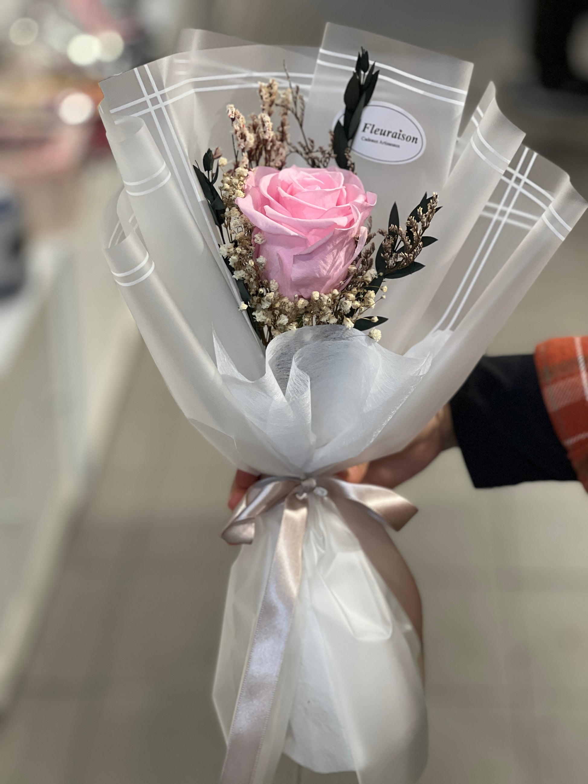 A single preserved rose, expertly treated to maintain its form and colour for years. Wrapped in refined, modern packaging with preserved botanical accents, this piece is designed to last long after the moment has passed.