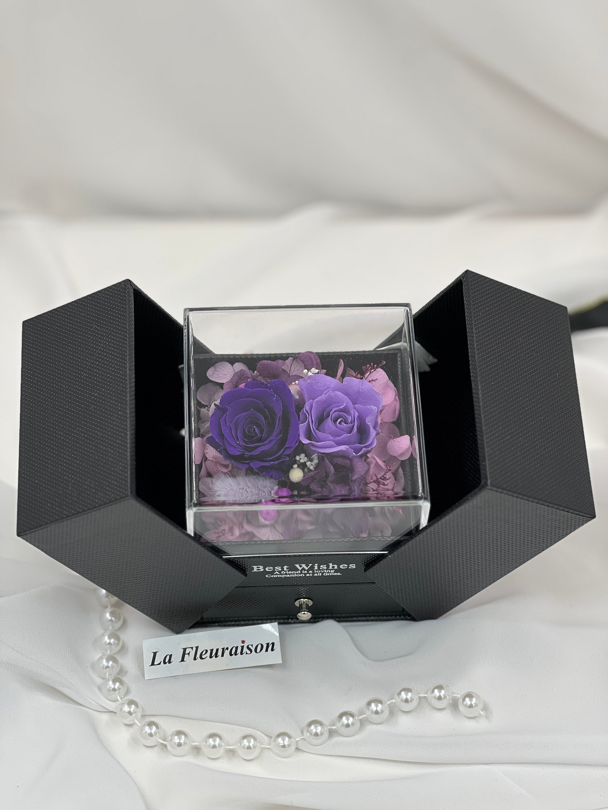 Experience everlasting beauty with the Eternal Elegance Duo Collection. This stunning box features a clear top and closing lid, showcasing two preserved roses that will never wilt or fade. Perfect for gifting or adding a touch of elegance to any space.