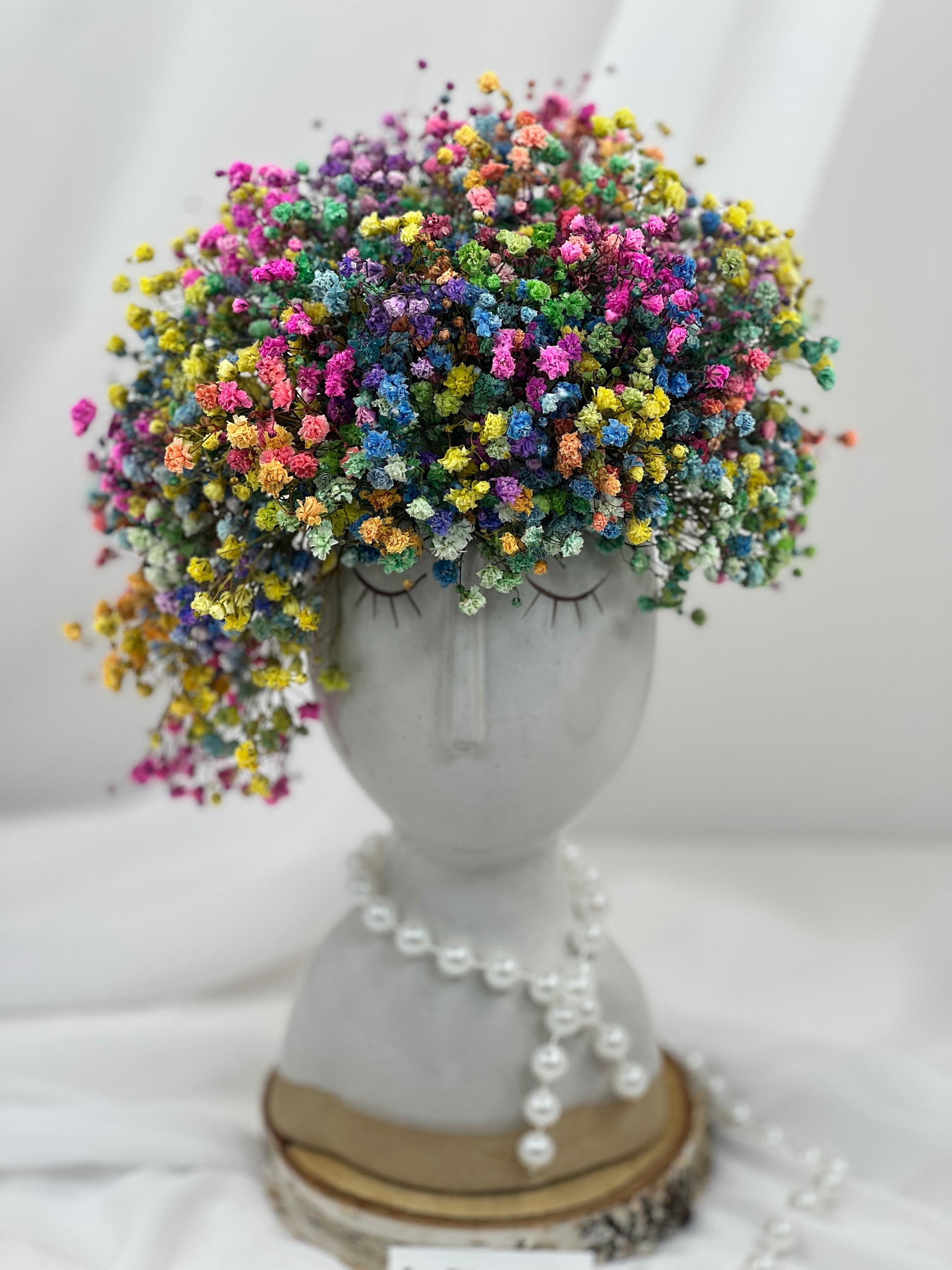 Transform any space into a vibrant and whimsical garden with our Festival of Blooms! This head-shaped vase features a stunning arrangement of preservedmulticoloured gypsophila, resembling a beautiful crown of flowers. Bring life and joy into your home with this unique and eye-catching piece.