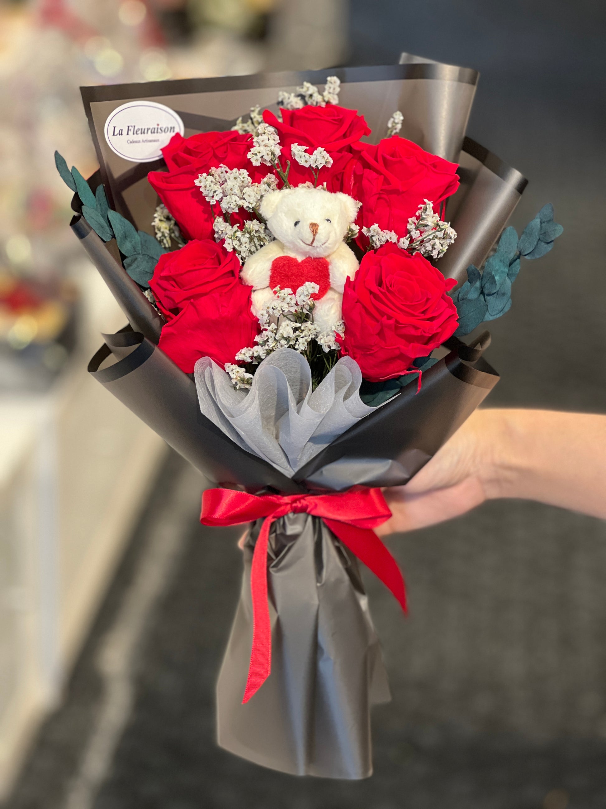 A refined bouquet featuring premium preserved roses, carefully arranged and wrapped for a timeless presentation. Designed to retain its beauty for months without water or maintenance, this piece offers a lasting expression of sentiment and elegance. Suitable for all occasions where permanence matters.