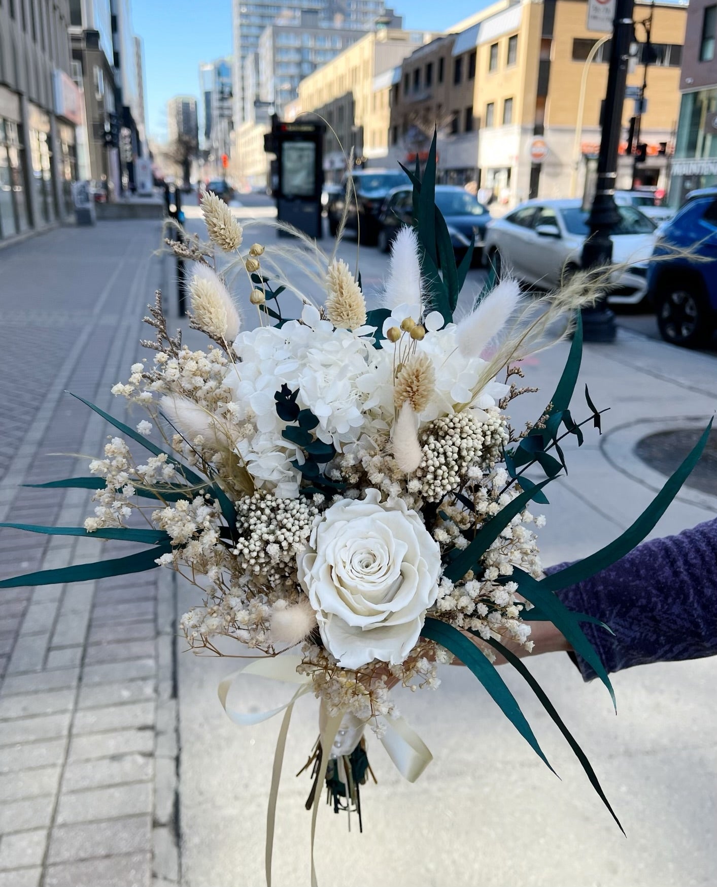 Experience the beauty of winter with Winter's Whisper. This elegant bouquet features carefully preserved white flowers, providing a lasting reminder of the crisp, delicate charm of the season. Add a touch of sophistication and everlasting allure to any space with this timeless arrangement.