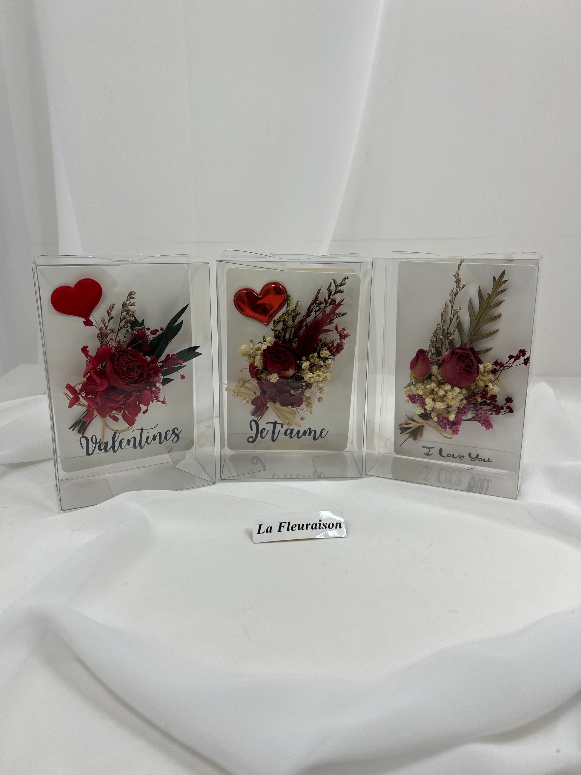 The Valentine’s Edition Card features a handmade mini preserved flower bouquet encased in a plastic case, ensuring longevity and protection. Each card is unique in design, offering a personalized touch. This product combines artistry with durability, making it an ideal keepsake for commemorating special occasions.