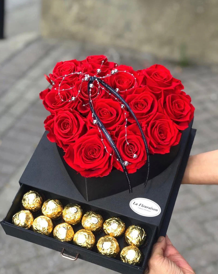 This beautifully designed Box of preserved roses will not only add a touch of elegance to any setting, but also bring joy to your loved ones with a hidden drawer filled with delicious Ferrero Rockers. A heartfelt gift for any occasion!