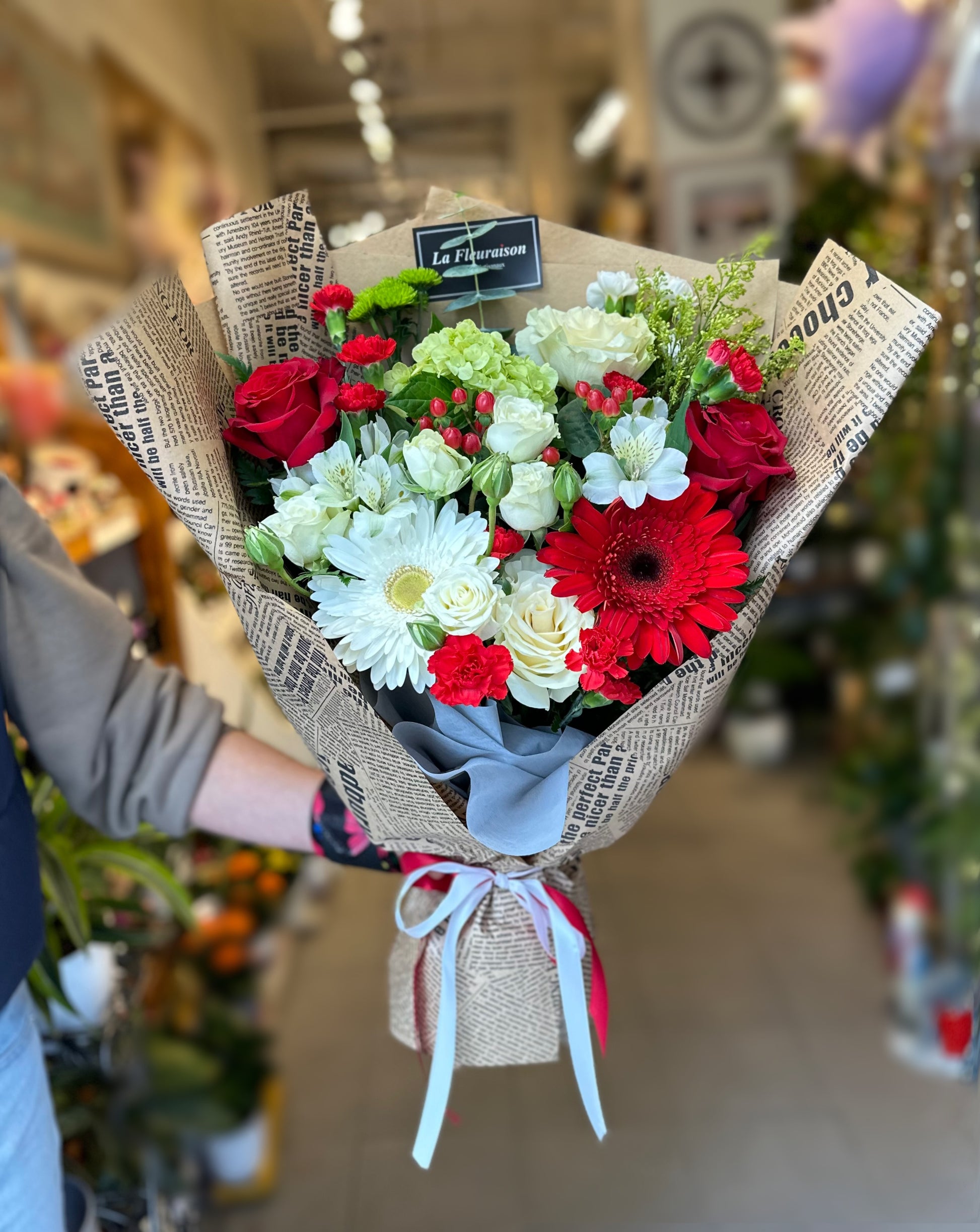 Celebrate the holidays with elegance and grace with our Holiday Elegance bouquet. This stunning arrangement features a mix of white and red roses, gerberas, mini hydrangeas, solidago, carnations, spray roses, hypericum, and alstroemerias. Spread joy and love with this festive bouquet!