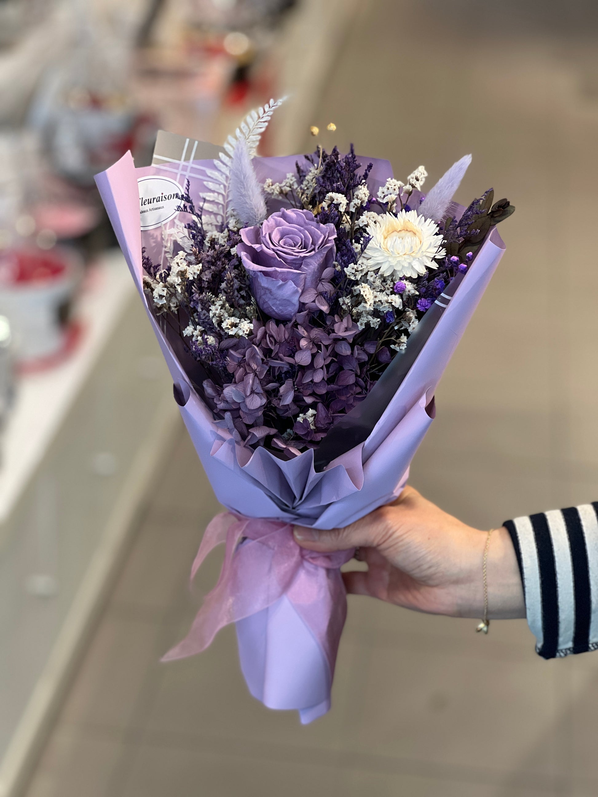 Indulge in the everlasting beauty of the Moonlit Amethyst bouquet. Featuring preserved purple roses, purple and white hydrangeas, this bouquet adds a touch of elegance to any space. Enjoy the benefits of long-lasting, low maintenance flowers without compromising on style.